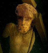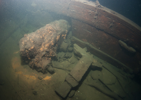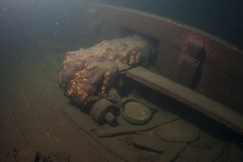 The wreck has 12 gun ports on one deck, with six guns still present in their original positions. Whether more guns were present or if they were taken over board in an effort to save her at the time of her sinking is unknown. In addition to deck guns, other details lying on the deck include remains of ropes, buckets, remains of a steering wheel and stock of a rifle. Ship’s figurehead, a man figure, is lying on the seabed, just under the bow. Hatchways on gun deck are open, and remains of a barrel and pieces of wood are visible in the silt underneath them.